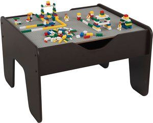 The aforementioned activity table from KidKraft is famous for its reversible tabletop. This tabletop showcases a building brick surface on one side and an illustrated play surface on the other. The incorporated play board is compatible with most Lego products. There are 200 Lego-compatible blocks to include.